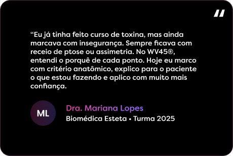 O WV45® organiza a toxina em 45 pontos estratégicos e elimina marcações aleatórias. Você passa a saber exatamente onde marcar, quanto aplicar e por quê, reduzindo riscos como ptose, assimetrias e resultados artificiais.