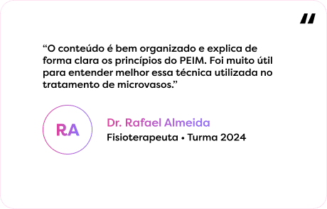 Domine os princípios do PEIM para microvasos em um curso online estruturado, com 40 horas de conteúdo e 12 meses de acesso para estudar quando quiser. Amplie seu conhecimento sobre essa técnica e fortaleça sua base para conduzir o procedimento com mais segurança.